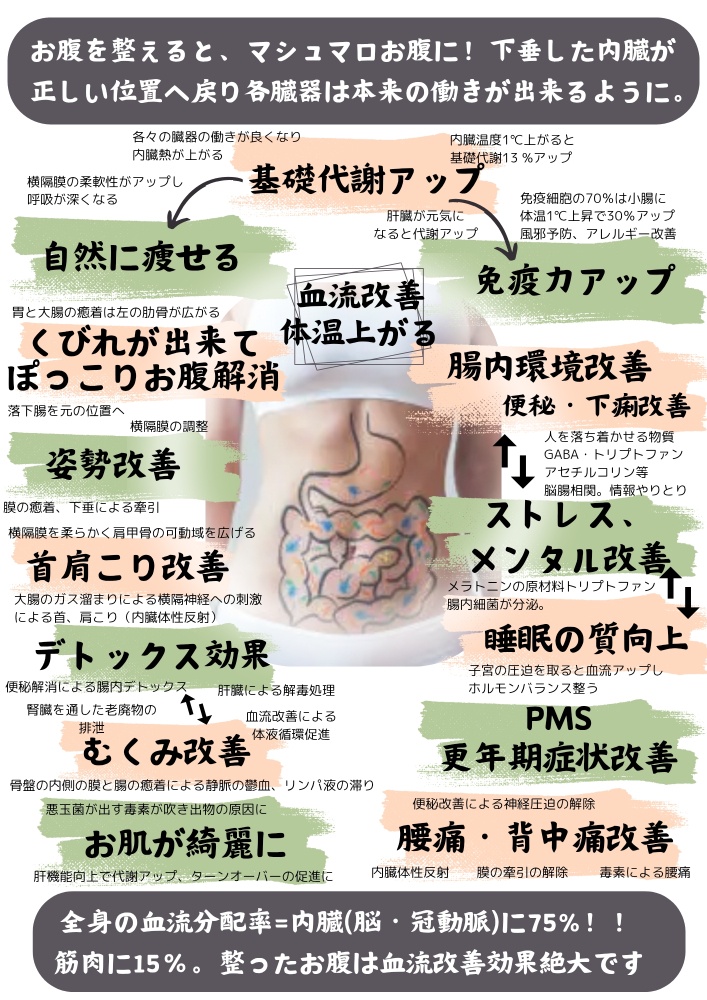 他の臓器も全て連動して身体を作っているので、腸もみ+胃、肝臓、横隔膜、腎臓、胆嚢、生殖器、等にもアプローチは必須なのです。